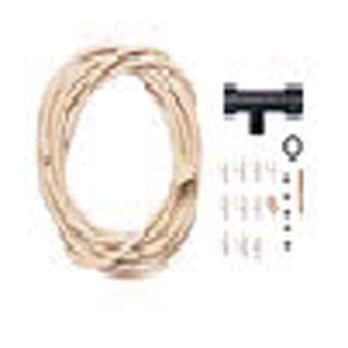 This kit includes a (20 feet) of 3/8 inch Preassembled Flexible Tubing, (5) Brass Misting Nozzles, (10) Hanging Clamps, (1) Hose Washer, (1) Brass Automatic Drain Valve