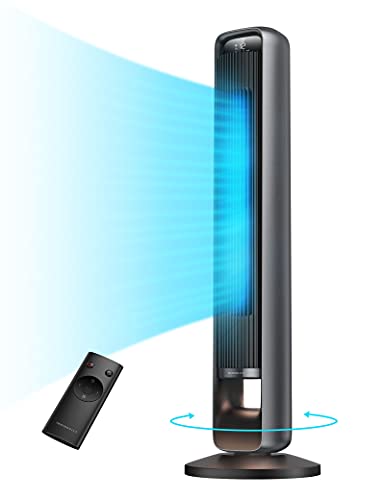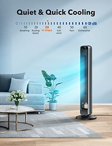 Quiet & Energy Saving: This standing oscillating tower fan with remote adopts a DC motor to work quietly at 28dB on the lowest speed level, much quieter than the traditional 56dB, and with 20W rated power which saves more energy than traditional 60W AC motors Personalized Comfort: The bladeless tower fan is designed with 4 wind modes including Normal Mode (runs at selected speed; 12 speed levels), Sleep Mode (fan speed reduced by 2 levels every 30min; 3 speed levels), Natural Mode (fan speed fluctuates to mimic natural wind; 3 speed levels), and Auto Mode (fan speed changes as ambient temperature varies; 12 speed levels), offering 30 cooling options to meet all your needs Wider Coverage: A 42-inch height together with the 90-degree oscillation projects a refreshing breeze as far as 6 meters. This floor fan provides wider coverage of airflow compared to other 65°oscillating fans. Pairs with your air conditioner, this stand up fan bring cool airflow to your room faster with its wide 90° angle oscillation Customizable Night Light: Warm yellow light (2700K) illuminates the way if you have to get up at night, and you can set the brightness between High, Low, and Off so it won’t cause discomfort or disturb your sleep Extremely Stable Fan Base: Built with a DC motor and an oscillation system that work with less machine vibration; well-designed structure with large contact area between the fan body and base makes the electric tower fans stand more stable on the floor Easy Assembly & Cleaning: The base with mortise-tenon joint allows you to assemble the fan body onto the base without any tools, and the detachable back grill provides an easy way to regularly remove the dust from the air inlet User-Friendly Features: 1 to 12-hour timer provides more options to turn the fan off when you go to bed; under Sleep Mode operation is mute and the LED display will turn off automatically after 1 minute of no operation