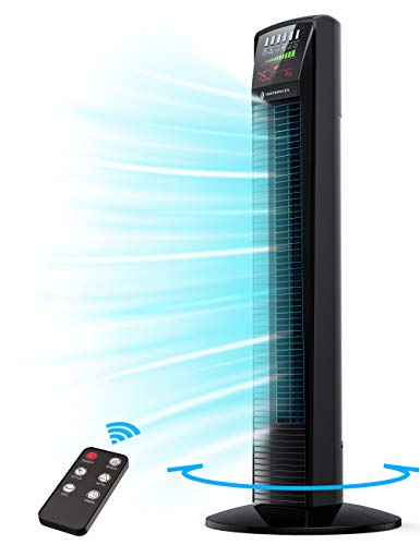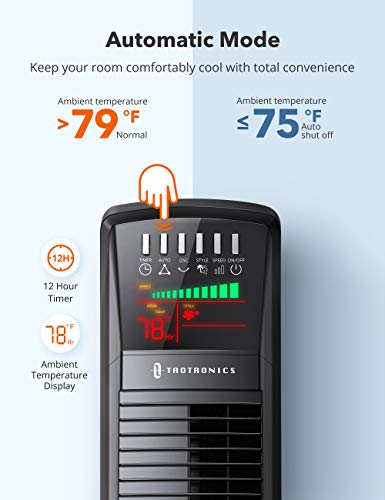 Airflow Customization: Tower fan is equipped with 3 breeze modes (Normal, Natural, Sleep) and 3 fan speeds (High, Medium, Low), offering 9 cooling options to meet all your needs Wider Coverage: 65°oscillating cooling fan is your air conditioner’s BFF distributing air with a velocity of 20ft/s to increase air flow and circulation for quick cooling that saves energy Quiet Cooling: Tower fan is expertly engineered to produce little noise that won’t disturb your sleep (Note: LED display automatically turns off after 30 seconds in sleep mode) Child Safe: ETL-certified bladeless tower fan designed with narrow fence to not endanger children; a fused safety plug prevents damage from over-voltage and power surges Automatic Mode: Activate auto mode for the tower fan to run while the ambient temp is over 79°F and auto shuts off when less than 75°F, you’ll always inhabit a pleasant and healthy space Mounting Type: Free Standing